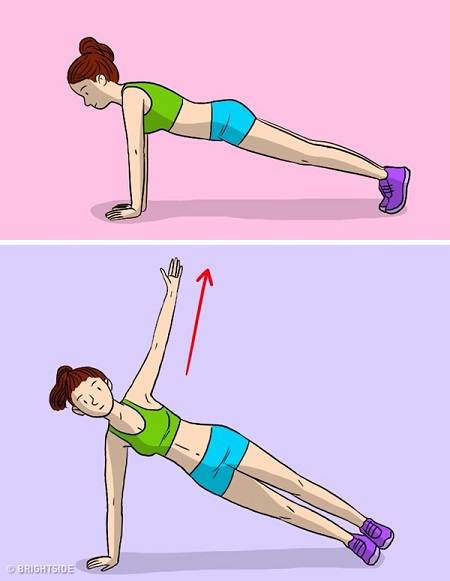 Bài tập thứ 5: Chống đẩy trên thảm, nhấc một tay, nghiêng người đưa lên cao. Lặp lại động tác 15 lần mỗi bên.