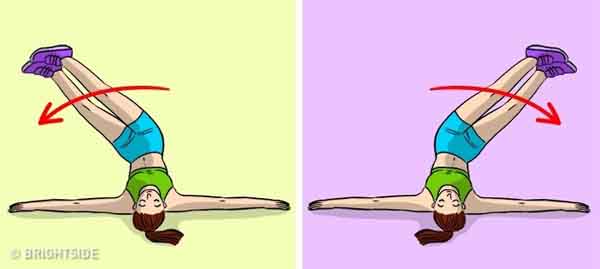 Bài tập thứ 4 yêu cầu bạn nằm ngửa trên thảm, hai tay duỗi thẳng ngang vai, nâng chân và hông lên cao, nghiêng người sang hai bên 15 lần.