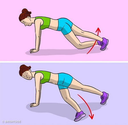 Bài tập thứ 2 là bài chống đẩy trên thảm. Một đầu gối chạm đất rồi đá thẳng sang phía bên kia, lặp lại động tác 15 lần mỗi chân.