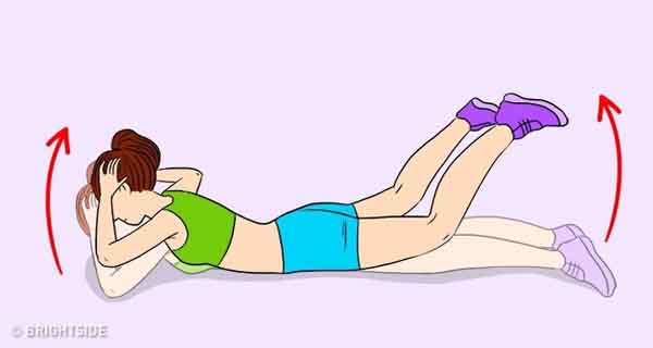 Với bài tập này, bạn cần thực hiện như sau: nằm sấp trên thảm, hai tay để nhẹ trên đầu, chân duỗi thẳng, dùng cơ bụng nâng người và chân lên cao. Lặp lại động tác 15 lần.