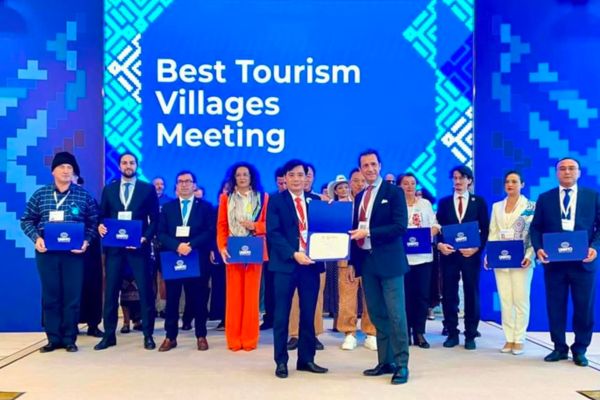 Đại diện UBND xã Tân Hóa nhận danh hiệu “Làng du lịch tốt nhất thế giới”.
