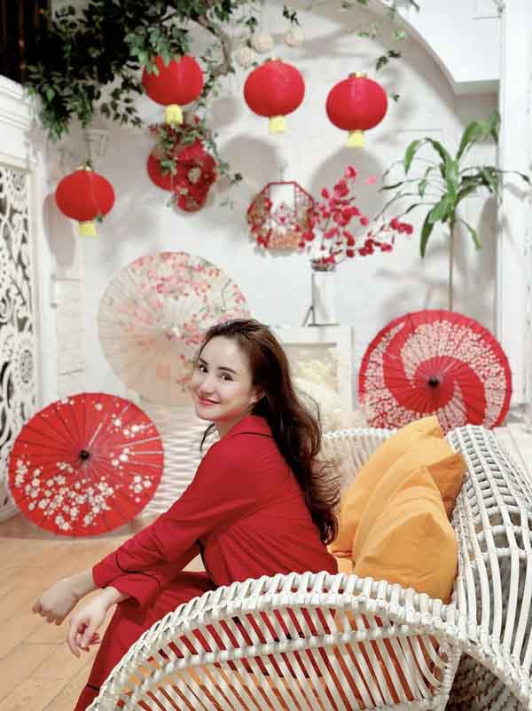 Trong đó, màu đỏ chính là tông chủ đạo mà giọng ca “Đồng xanh” ưu tiên lựa chọn trang trí cho ngôi nhà của mình. Bức ảnh check-in của cô bên hiên nhà, có thể thấy, nào là lồng đèn, chiếc ô, hoa đào,… đều rực rỡ sắc đỏ.