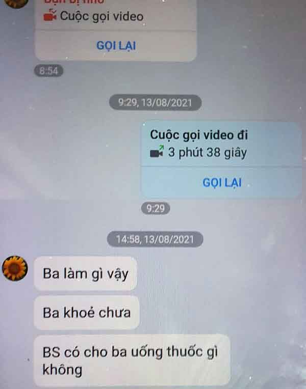 “Ba làm gì vậy? Ba khỏe chưa? Bác sĩ có cho ba uống thuốc gì không?…”, những tin nhắn được em Hạ Chí Trung (8 tuổi) nhắn cho ba là anh Hạ Chí Hùng (50 tuổi) khi anh đang nằm điều trị Covid-19 tại Bệnh viện Nhân dân Gia Định. Tin nhắn được Trung gửi cho ba lúc 14 giờ 58 ngày 13.8, không ai ngờ rằng đó là dòng tin nhắn cuối cùng con trai hỏi thăm ba mà không bao giờ nhận được hồi đáp.