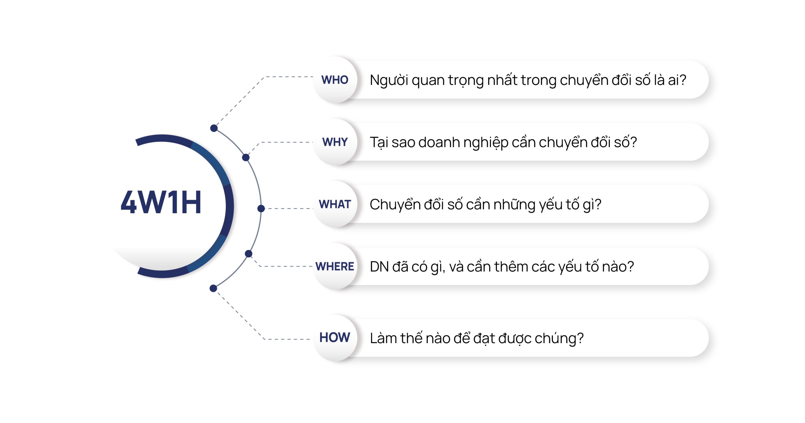 Doanh nghiệp cần phải tự đặt ra các câu hỏi 4W1H để tự đánh giá năng lực số của mình, sau đó trả lời chúng theo thứ tự. 4W1H bao gồm: