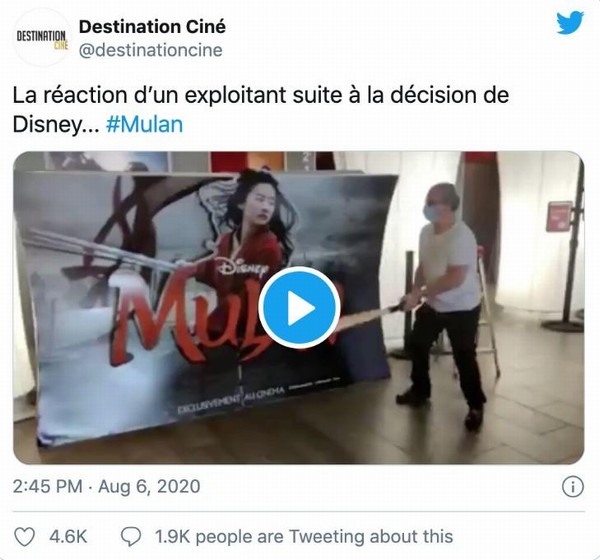 Ông Gerard Lemoine – chủ một rạp phim nhỏ tại Pháp đã chia sẻ với trang Deadline rằng ông quyết định quay lại video này để bày tỏ sự thất vọng sau khi nghe về việc Mulan sẽ chiếu trực tuyến. Lemoine đã đặt poster quảng cáo cho Mulan trong nhiều tháng và dành nhiều hy vọng vào việc phim sẽ giúp rạp chiếu của mình tái khởi động trở lại. “Không có Mulan, chúng tôi đã mất đi cơ hội mang đến cho khán giả một bộ phim được chờ đợi từ rất lâu và đó cũng là điều giúp chúng tôi vượt qua những khó khăn hiện tại. Disney đã đưa ra một quyết định tồi tệ”, Lemoine nói. Video này đã vượt qua cả sức tưởng tượng của Lemoine khi nó đã thu hút hơn 150 nghìn lượt xem trên Twitter và nhận được vô số phản hồi.