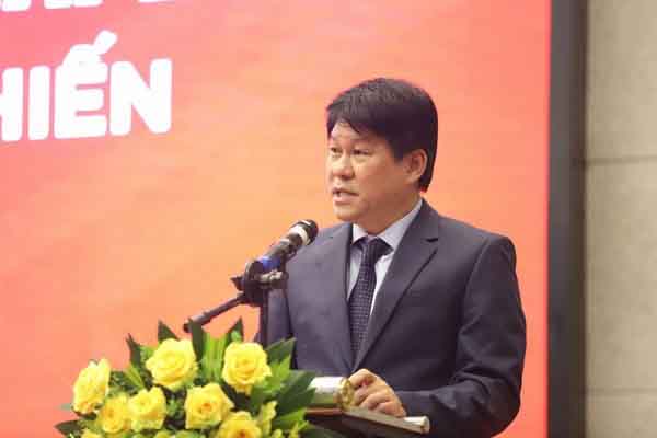 Chủ tịch CLB Phố Hiến Vũ Tiến Thành phát biểu tại lễ xuất quân CLB sáng 10.3