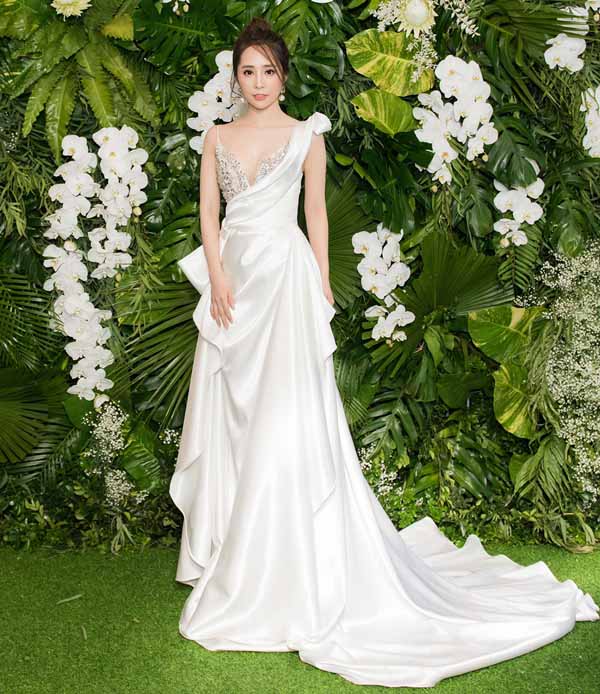 Trong ngày trọng đại diễn ra hôm 28/7, Đàm Thu Trang ghi điểm với váy cưới xếp ly tỉ mỉ của Chung Thanh Phong. Điểm đặc biệt của chiếc đầm cưới nằm ở kỹ thuật dựng phom corset giúp vòng eo nhỏ nhất có thể.
