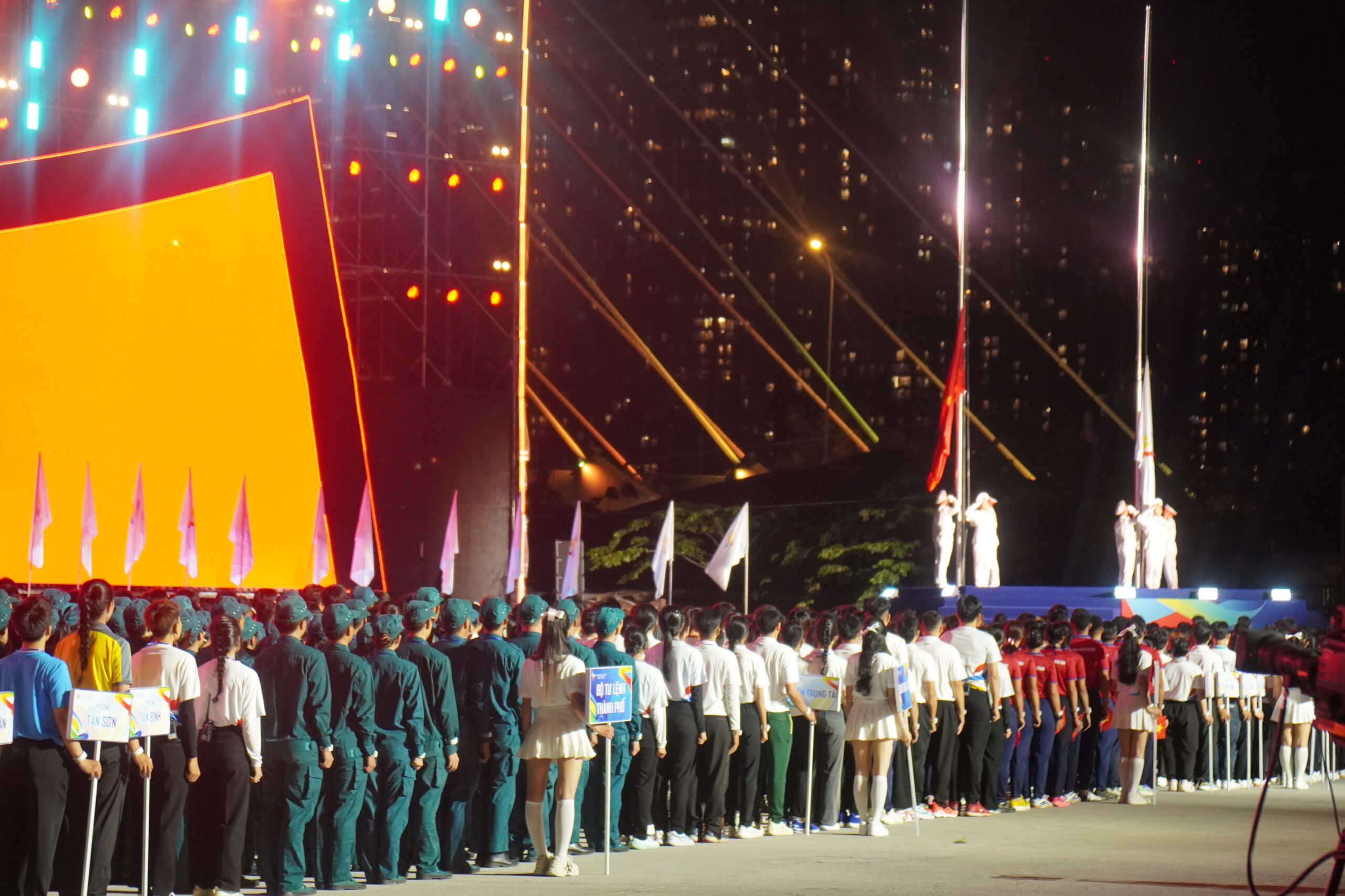 Ngay sau màn diễu hành, không khí buổi lễ trở nên trang trọng với nghi thức thượng cờ Tổ quốc và cờ Đại hội trên nền hợp xướng Quốc ca đầy khí thế.