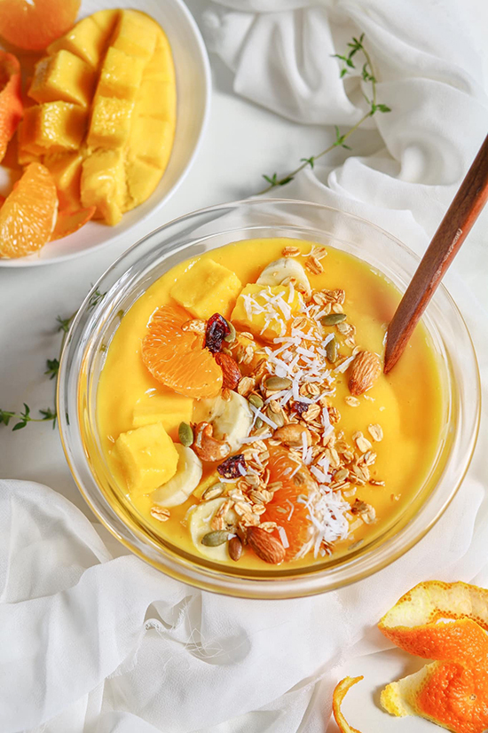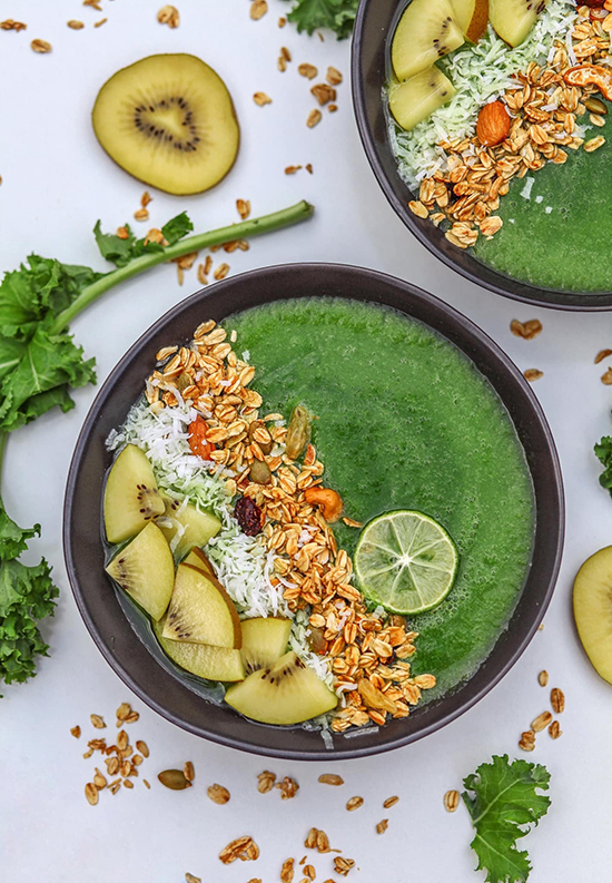 Công thức của món ăn bao gồm: cải kale, cam, chuối, granola, kiwi vàng, cơm dừa sấy.