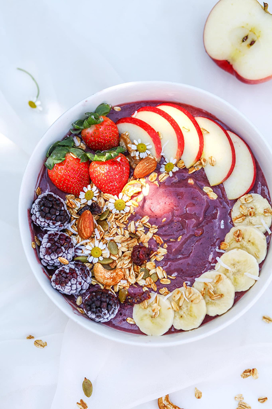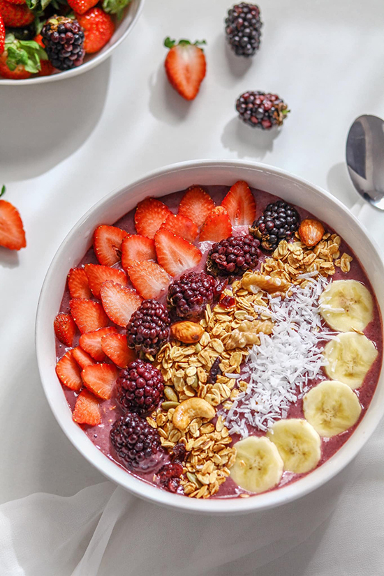 Công thức: dâu, chuối, mâm xôi, táo, sữa hạt, mật ong, granola.