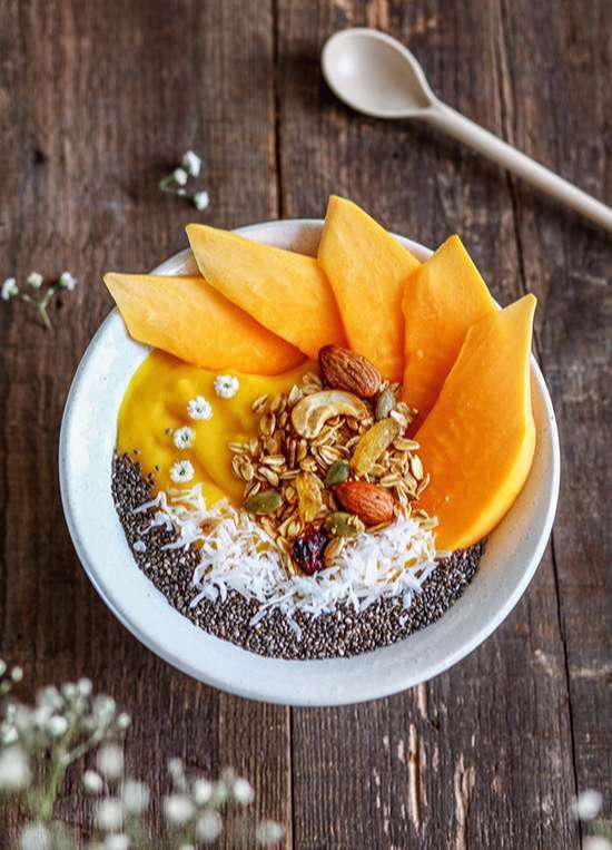 Một trong những bí quyết giúp tiết kiệm thời gian chế biến của Tiểu Ni chính là sơ chế trước trái cây rồi trữ đông từ đó giúp có thêm nhiều món món smoothie ở nhiều dạng frozen vừa ngon miệng lại vô cùng đẹp mắt. Công thức như sau: đu đủ, sữa hạt, mật ong, granola, hạt chia, dừa sấy.