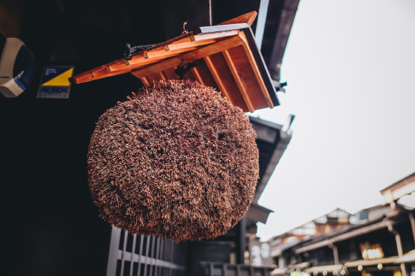 Quả cầu tuyết tùng Sake bayashi đặc trưng cho quán rượu ở Takayama.