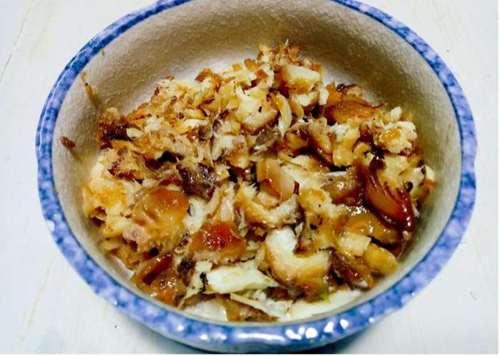 – Cá mặn xé nhỏ ra thành những miệng vụn vừa để khi chiên cá và cơm sẽ quyện lại với nhau.
