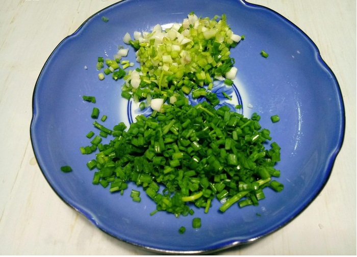 – Hành lá thái nhỏ, phần đầu hành để riêng, phần lá để riêng