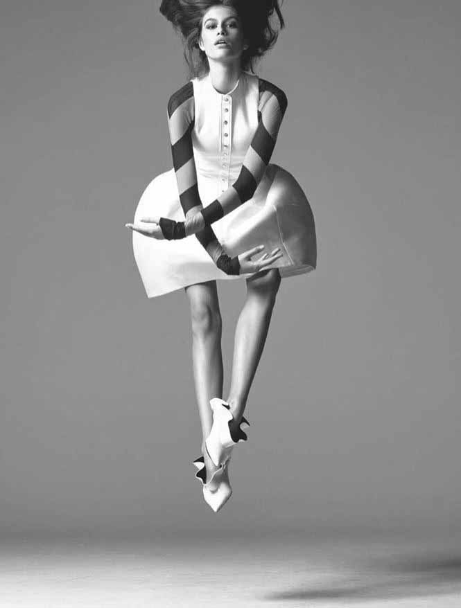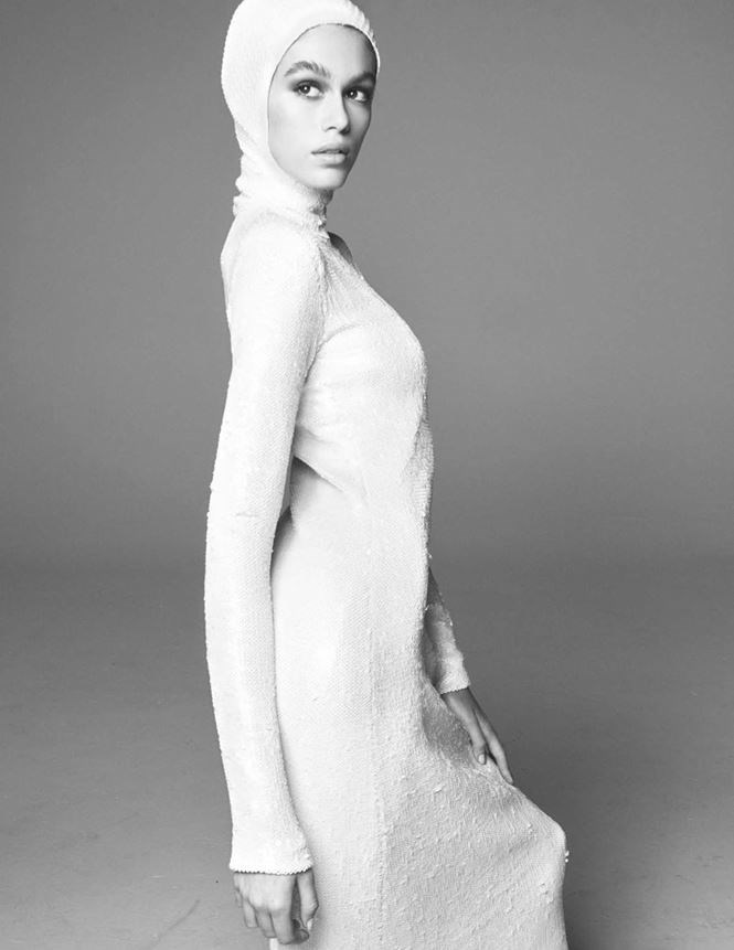 Dưới góc máy nhiếp ảnh gia Steven Meisel, Kaia bay bổng mê hoặc trong các mẫu thiết kế của Loewe, Louis Vuitton và Valentino.