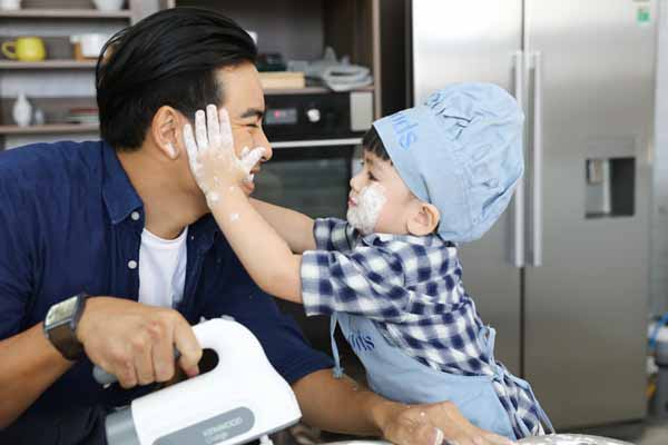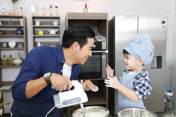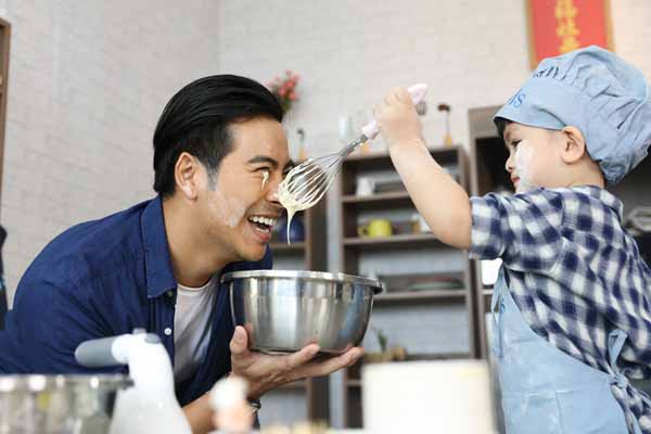 Con trai Ngọc Lan làm lấm lem mặt bố khi học làm bánh