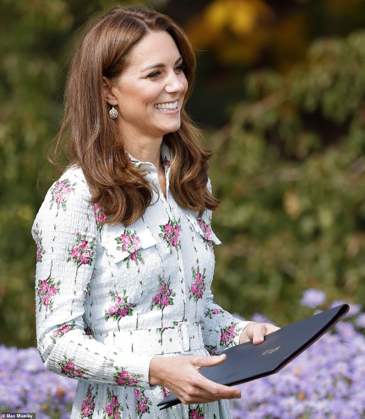 Nữ Công tước xứ Cambridge diện đầm tay dài họa tiết hoa đến từ thương hiệu Emilia Wickstead có giá 1.635 bảng Anh (gần 47 triệu đồng). Cô kết hợp hoa tai từ phụ kiện đường phố giá chỉ vỏn vẹn 5 bảng Anh (gần 150 nghìn đồng) và giày cao gót đế xuồng đồng điệu với váy, khoe vẻ đẹp thanh lịch, nữ tính.