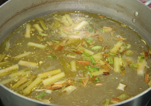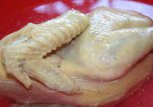 – Gà và đầu gà rửa sạch, nấu lấy nước dùng, vớt bọt cho nước lèo trong, vớt gà ta xé miếng vừa ăn.