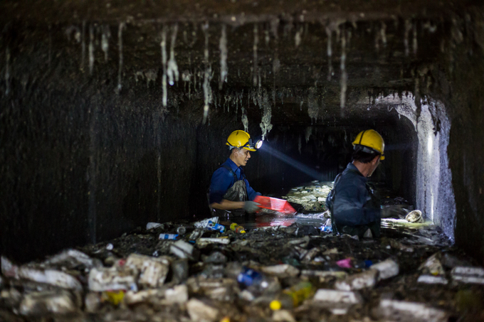 Những người công nhân này, thường phải dầm mình khoảng 5 tiếng đồng hồ dưới cống nước hôi thối để vớt lên hàng tấn rác phía dưới.