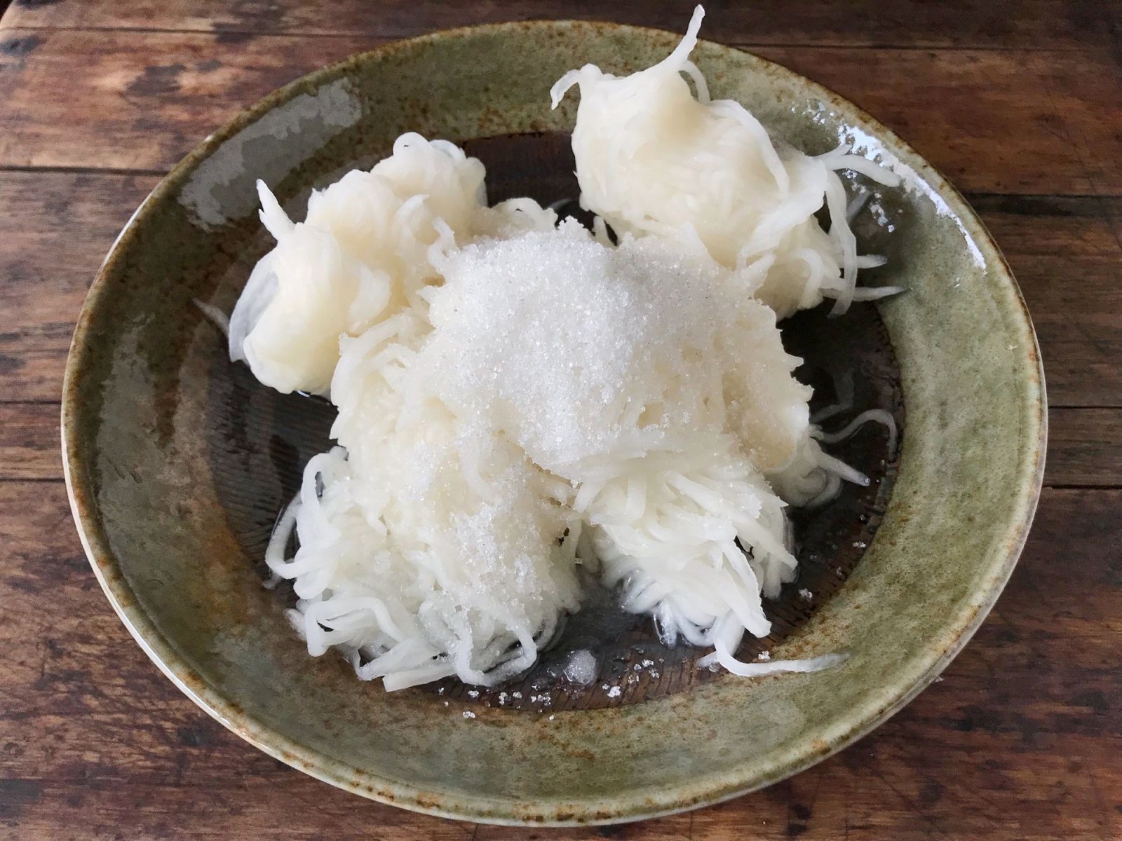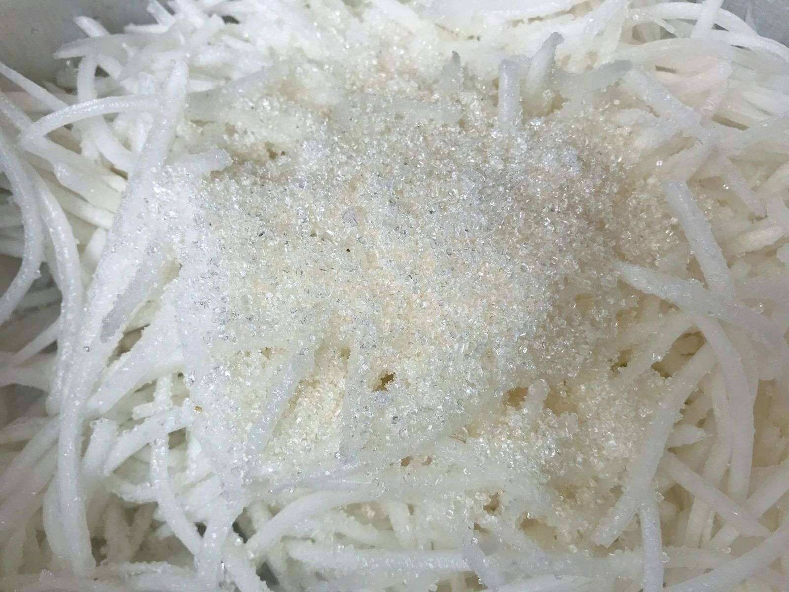 Cho củ cải bào vào thố, thêm 2 thìa muối và 3 thìa đường vào trộn đều. Ướp trong khoảng 1 giờ.