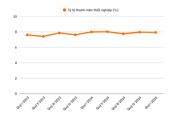 Tỷ lệ thanh niên thất nghiệp ở Việt Nam giai đoạn năm 2023 – quý I 2025 nằm ở mức báo động (độ tuổi 15-24 tuổi) – Nguồn: Dữ liệu Cục Thống Kê