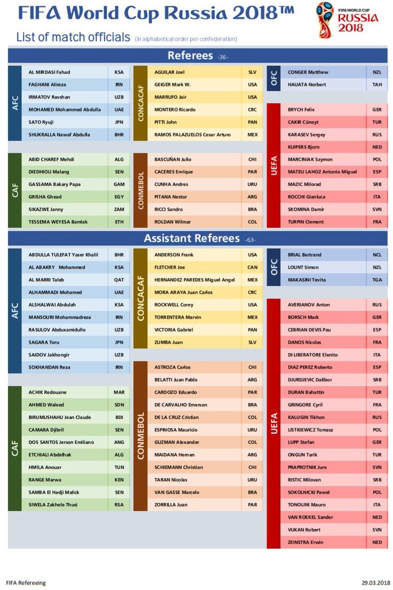 Trong danh sách này, các Liên đoàn bóng đá châu Á, châu Phi, Bắc Mỹ và Nam Mỹ đóng góp 6 vị trọng tài trong khi đó châu Đại Dương có đến 2 đại diện. Các trọng tài bắt các trận chung kết Champions League năm 2014, 2015 và 2017 cũng được chọn tới Nga bao gồm Bjorn Kuipers (Hà Lan), Cuneyt Cakir (Thổ Nhĩ Kỳ) và Felix Brych (Đức).