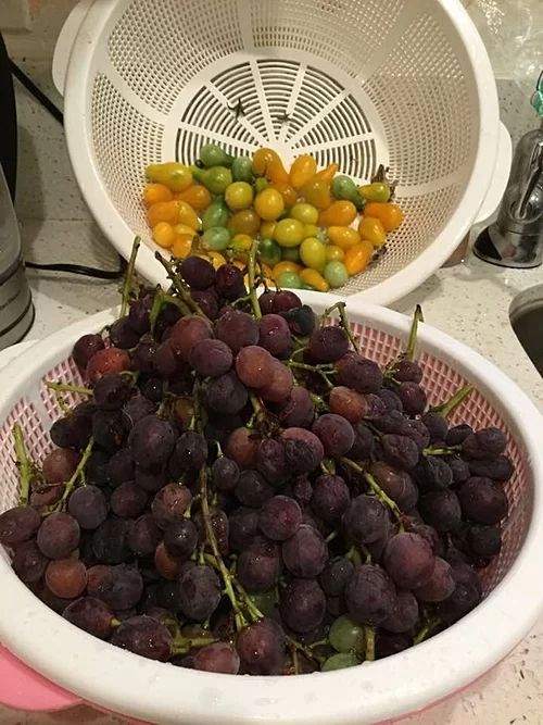 Nho và cà chua bi đều được hái từ vườn nhà. Quả nhỏ, ngọt thanh và ‘sạch 100%’.
