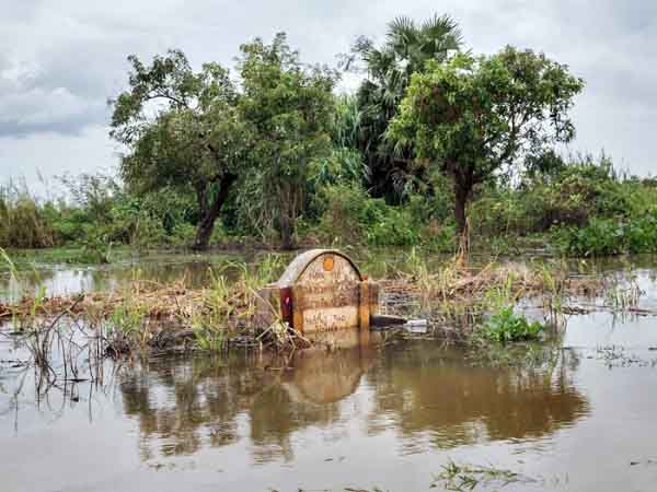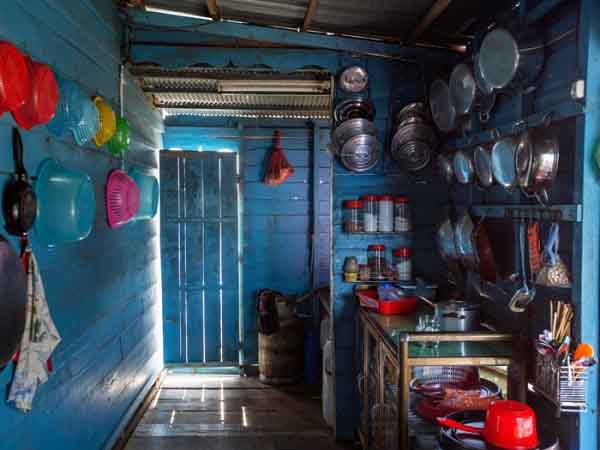 Đây là một gian bếp của gia đình ông Hoarith. Không có gì khác biệt, trừ việc nó nằm trên mặt nước. Taing Hoarith kể, vào mùa mưa mỗi năm, ông thường phải sửa lại bức tường lợp bằng lá cọ đã bị bão làm hư, hay có khi là dọn dẹp đám cây mọc trong nước. Thậm chí, ông phải lặn xuống bên dưới căn nhà, miệng ngậm một ống cao su và chèn vào những hũ xi măng đang giữ căn nhà đứng vững trên nước. Ảnh: New York Times.