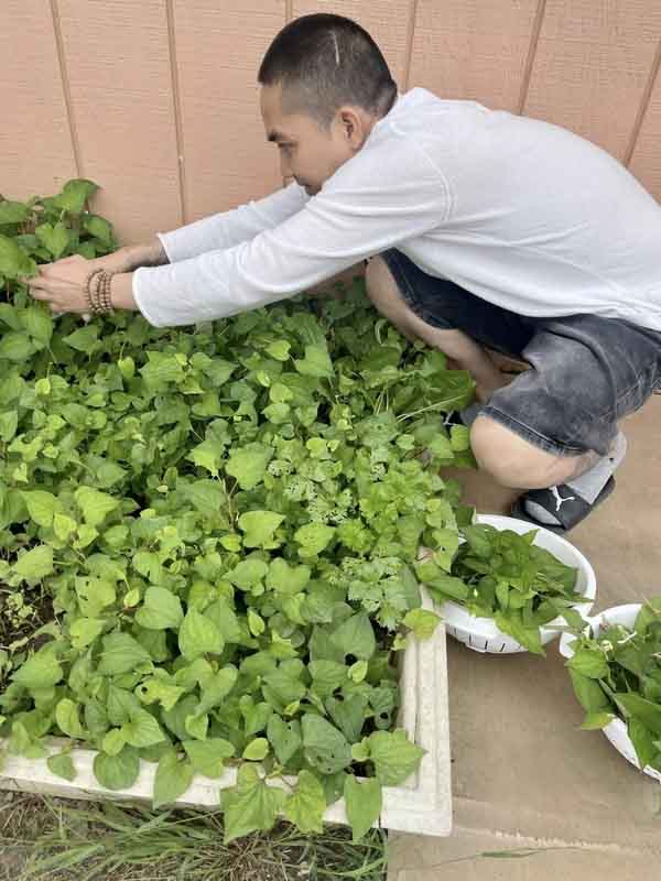 Nam ca sĩ tỉ mỉ chăm chút cho vườn rau xanh của mình.