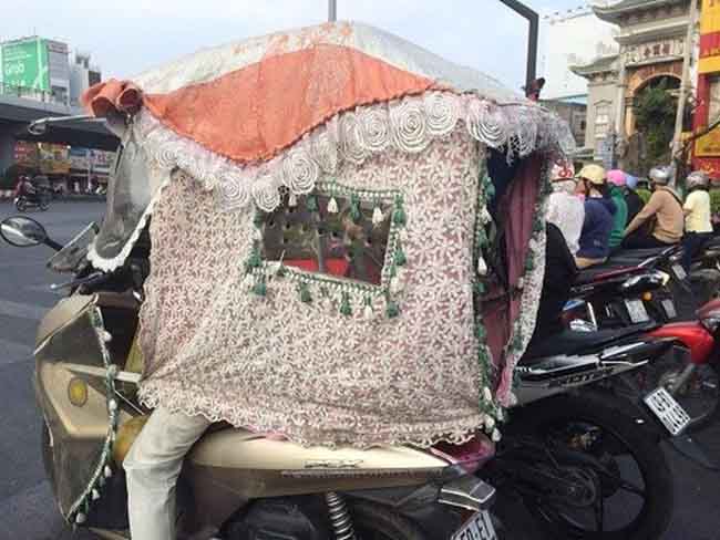 Đa phần khi ra đường nhiều người đều chuẩn bị cho mình những dụng cụ chống nắng như áo, mũ, găng tay, khẩu trang và thậm chí nhiều người còn lắp hẳn chiếc lều di động trên chiếc xe của mình.