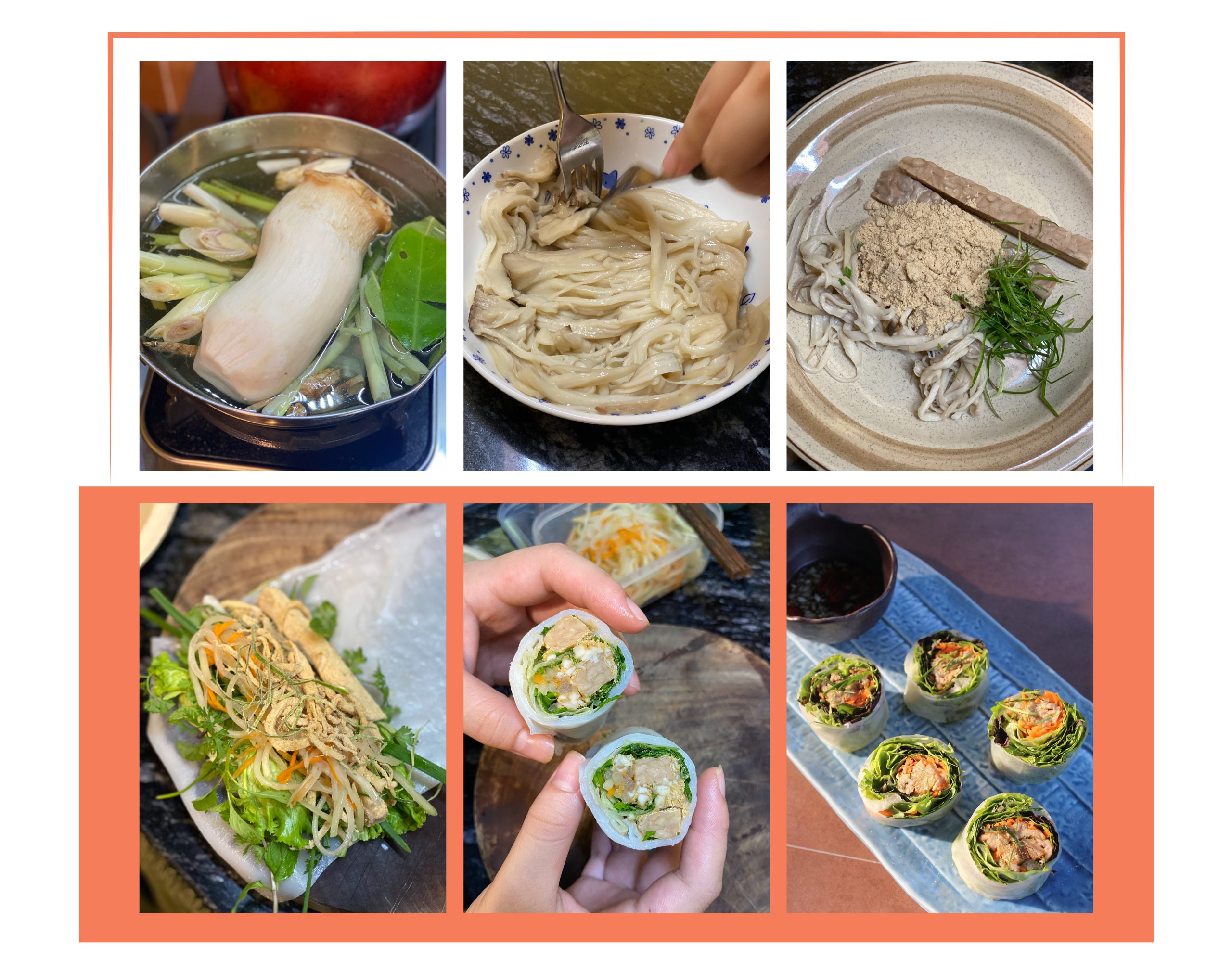Từ những nguyên liệu đơn giản, mình tạo nên một món cuốn mùa hè – nhẹ nhàng, tươi mát, dễ làm và vẫn đủ đầy dinh dưỡng. Nhân cuốn gồm nấm đùi gà xé nhỏ, tempeh chiên sơ, trộn đều với thính và lá chanh thái sợi. Ăn kèm là rau sống các loại, thêm chút đu đủ, cà rốt ngâm chua ngọt cùng gừng và vài lát xoài chín. Tất cả được gói gọn trong một chiếc bánh tráng dẻo, đặt lên lớp mì lá mỏng, cuộn tròn chặt tay – tạo nên món cuốn nhỏ xinh, dễ ăn, phù hợp cho những ngày không muốn nấu nướng cầu kỳ.
