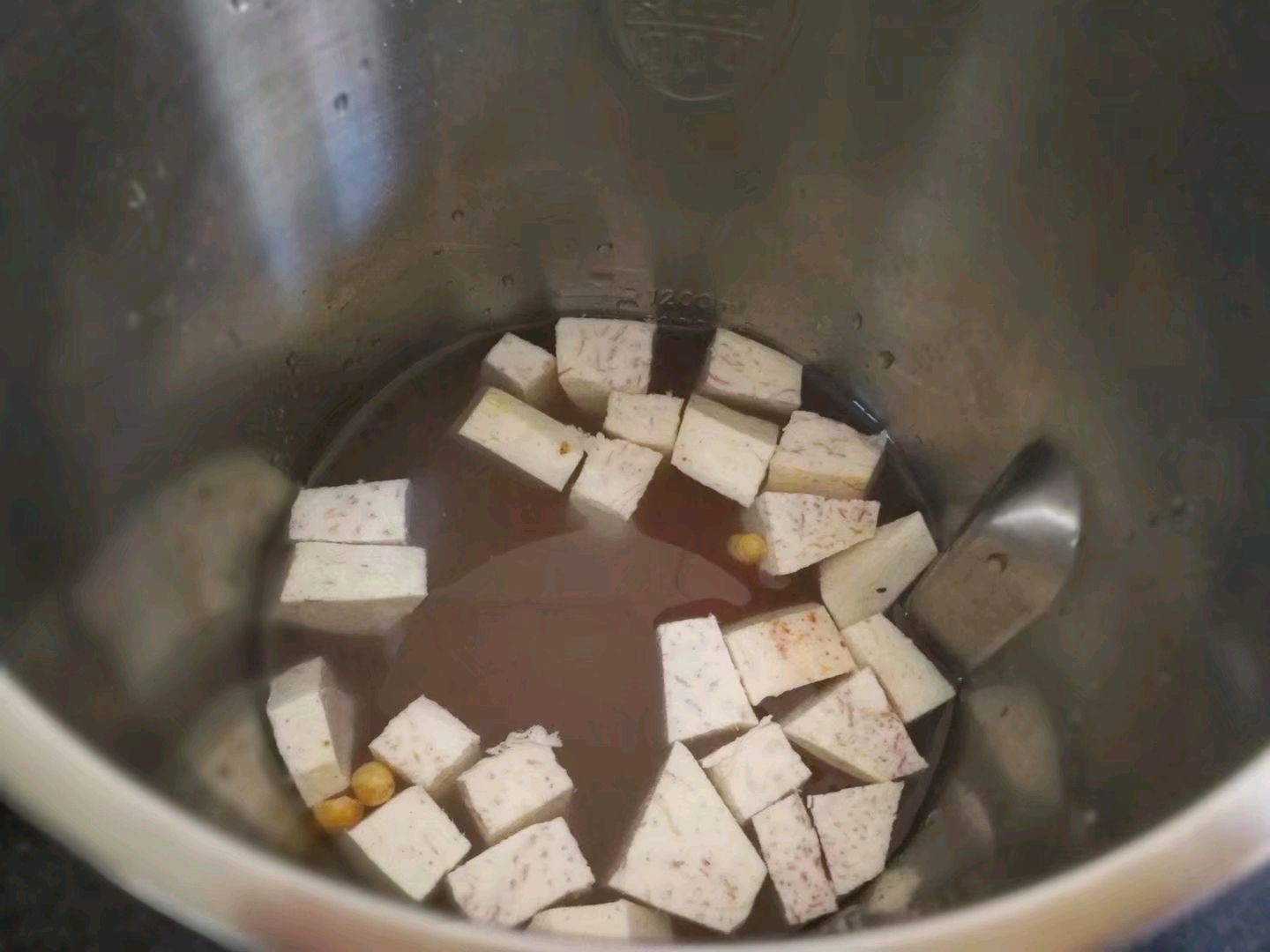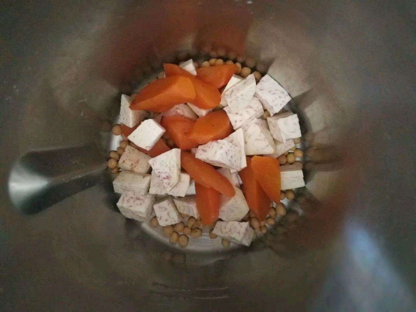 Cà rốt nạo vỏ, đậu tương ngâm qua đêm cho mềm. Sau đó cho đậu tương, cà rốt cắt miếng, khoai môn cho vào nồi.