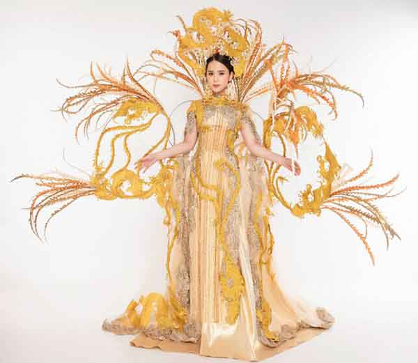 Mang đến Miss Eco Teen International trang phục dân tộc tiêu biểu tôn vinh những giá trị truyền thống của lịch sử và văn hóa Việt Nam, Vũ Huyền Diệu đã tỏa sáng lộng lẫy trong bộ quốc phục ấn tượng, đẹp mắt và cầu kỳ nặng hơn 30 ký mang tên “Rồng – Phượng” của NTK Việt Hùng. Chiếc áo dài mang màu vàng đồng, cách điệu tay ngắn, đính thêm áo choàng voan. Điểm nhấn của trang phục là họa tiết rồng, phượng uốn lượn trên tà, lưng và cổ áo. Nhà thiết kế sử dụng kỹ thuật kết hạt thủ công, gắn số lượng lớn pha lê và thêu thêm sợi kim tuyến để tạo hình ảnh lấp lánh, nổi bật cho Vũ Huyền Diệu.