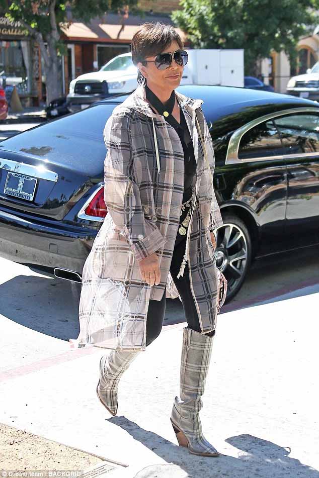 Ngôi sao truyền hình thực tế Kris Jenner không kém cạnh các sao nữ trẻ khi khoác lên người bộ cánh bó sát, điểm xuyến phụ kiện rườm rà ở vòng eo. Bên cạnh đó, mẹ của siêu mẫu Kendall Jenner còn gây chú ý với đôi boots cao và áo khoác trong suốt có họa tiết đồng điệu.