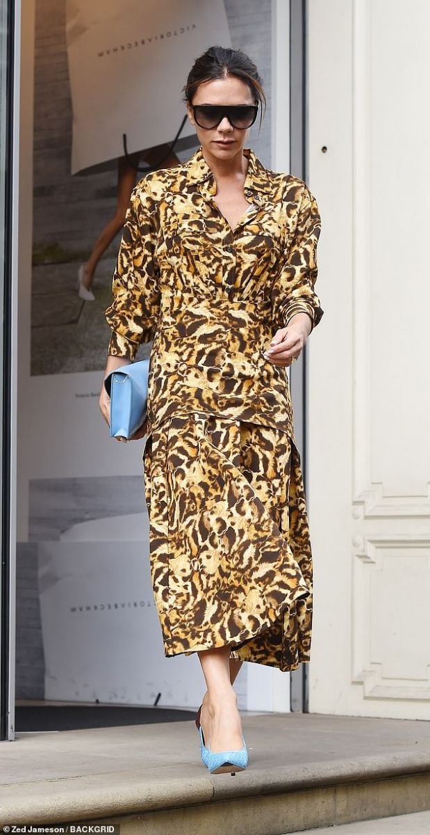 Nhà thiết kế Victoria Beckham giữ vững gu thời trang thanh lịch với đầm cổ sơ mi. Victoria Beckham chọn đầm cổ sơ mi bỏ nút họa tiết da báo khi xuống phố. Ngôi sao 44 tuổi còn nổi bật với túi xách và giày cao gót màu xanh biển.