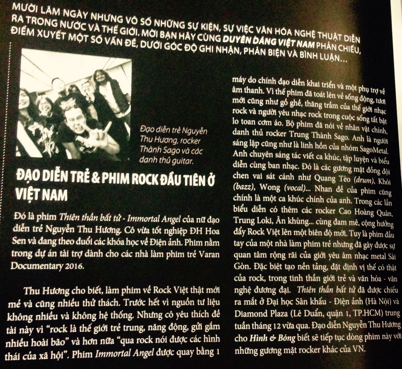 Bài viết của tạp chí DDVN giới thiệu về phim “Thiên thần bất tử – Immortal Angel” của nữ trẻ đạo diễn Nguyễn Thu Hương làm về Rock Sài Gòn và chân dung Thành Sago, tháng 1.2017.