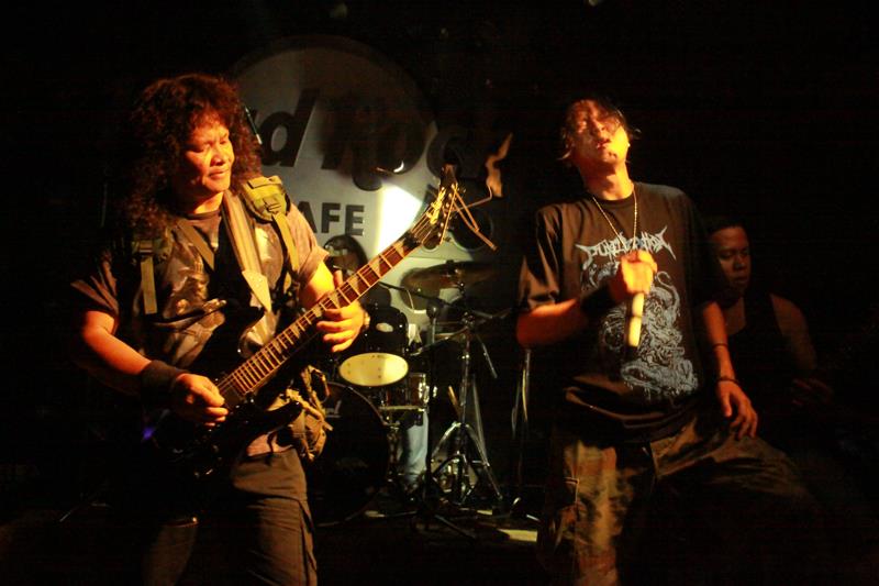 Thành Sago đang biển diễn cùng một ca sĩ hát nhạc rock.