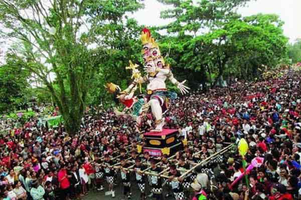 Toàn bộ người dân trên đảo dành cả ngày trong im lặng để cầu nguyện tại nhà hoặc trong các ngôi đền. Tuy nhiên, trước đó một ngày, đường phố Bali tràn ngập những hình nộm đầy màu sắc của những con quỷ có kích thước khổng lồ. Các cuộc diễu hành đầy màu sắc được tổ chức với các đội âm nhạc và pháo hoa gay cấn. Theo người dân trên đảo, hoạt động diễn ra trước ngày bắt đầu im lặng là để thu hút những điều xấu và quỷ dữ. Những linh hồn xấu xa và những điềm xấu sẽ nhập vào hình nộm và bị đốt cháy vào cuối ngày. Sau đó, từ đêm hôm trước cho đến khi chính thức diễn ra Lễ hội Im lặng, người dân đảo chỉ ở trong nhà hoặc đền thờ của họ để những điềm xấu không thể quấy rầy họ.