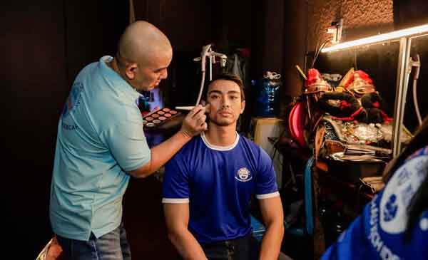 Đạo diễn Vũ Minh (trái) hóa trang cho học trò Công Phát, chuẩn bị vai diễn trong vở kịch thơ “Tình yêu nơi cung cấm”, tại Nhà hát Nụ Cười, TP HCM, ngày 23/1. Ảnh: Facebook Minh Dien Vu Nguyen