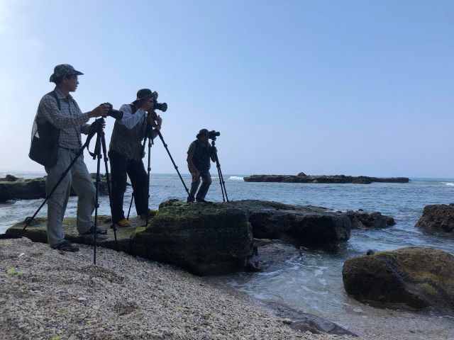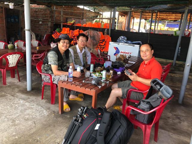 Nhà nhiếp ảnh Huỳnh Anh (bìa trái) và nhà nhiếp ảnh Quách Lực (áo đỏ) cùng bạn đồng nghiệp đang chuẩn bị đồ nghề săn ảnh trên đảo Lý Sơn – Quảng Ngãi.
