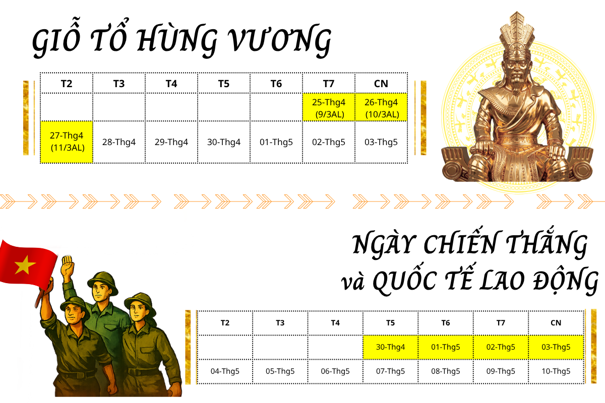 Theo lịch năm nay, ngày Giỗ Tổ Hùng Vương và kỳ nghỉ lễ 30.04, 01.05 tạo ra những khoảng trống ngắn ở giữa (ngày làm việc bình thường). Nhiều doanh nghiệp kiến nghị hoán đổi các ngày làm việc này sang một thời điểm khác để kỳ nghỉ được liên tục, tránh tình trạng bị ngắt quãng gây giảm năng suất.