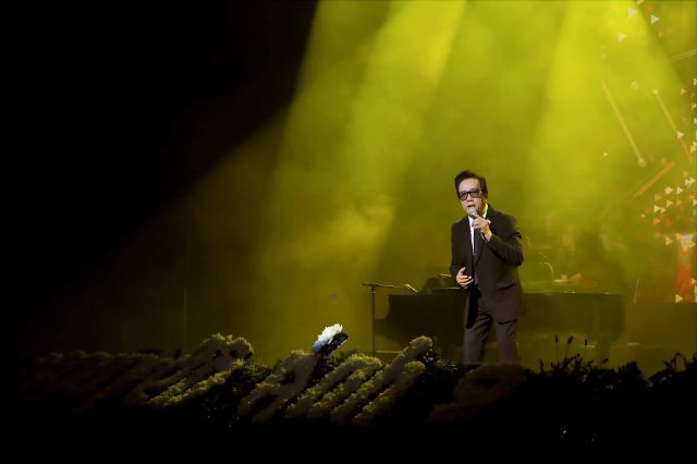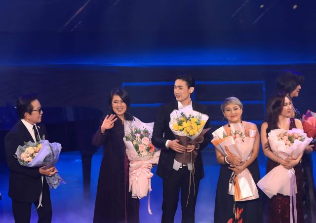 Nhạc sĩ Nguyễn Quang, Tổng đạo diễn chương trình “Xa vắng tiếng dương cầm” hạnh phúc với những lẵng hoa tươi thắm từ khán giả tặng sau đêm diễn ở nhà hát Opera House Đà Lạt.