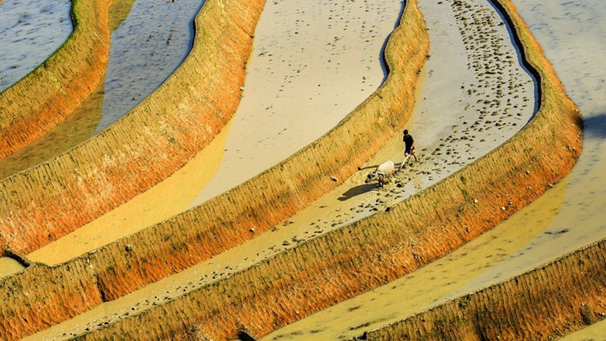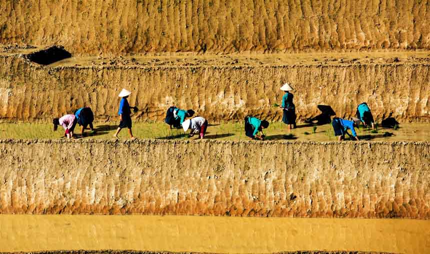 Đồng bào dân tộc thiểu số đang hăng say cấy trên những mảnh ruộng bậc thang của mình, giữa cái nắng của mùa hè chói chang. Khung cảnh rực rỡ nên thơ này là điểm ngắm của nhiều tay máy ảnh.