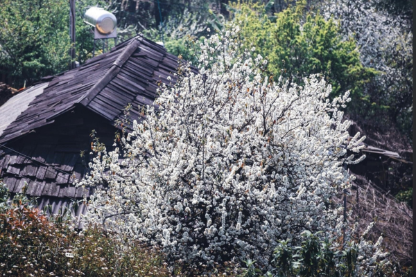 Ngay khi bước chân gần bản, du khách sẽ bắt đầu nhìn thấy những cây sơn tra trắng tinh khôi nổi lên giữa không gian núi rừng hùng vĩ. Con đường bê tông uốn lượn khắp bản là bức tranh sống động với hàng loạt cây hoa sơn tra nở trắng, làm tăng thêm vẻ thơ mộng cho cả vùng cao Nậm Nghiệp. Dù có nhiều vùng núi cao khác cũng có sơn tra nhưng ở đây, những cây sơn tra thấp, trồng tập trung, tạo nên những đám mây hoa trắng to lớn trước những ngôi nhà gỗ đơn giản, mái lợp rêu mốc, đưa lòng người về với một miền đất cổ tích đầy mộng mơ.