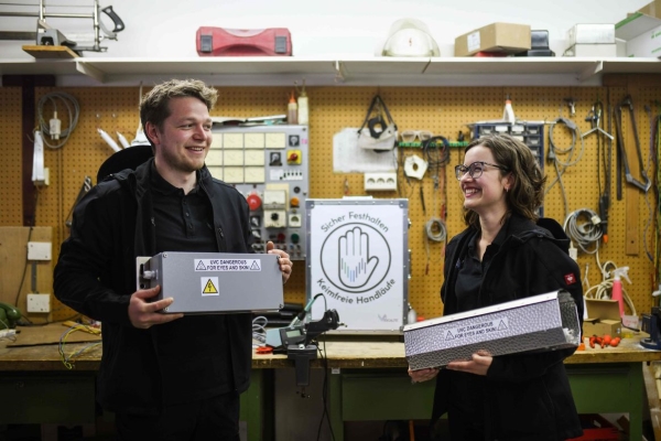 Katharina Obladen đứng cạnh một nhân viên kỹ thuật giải thích cách hoạt động của hộp đèn UV