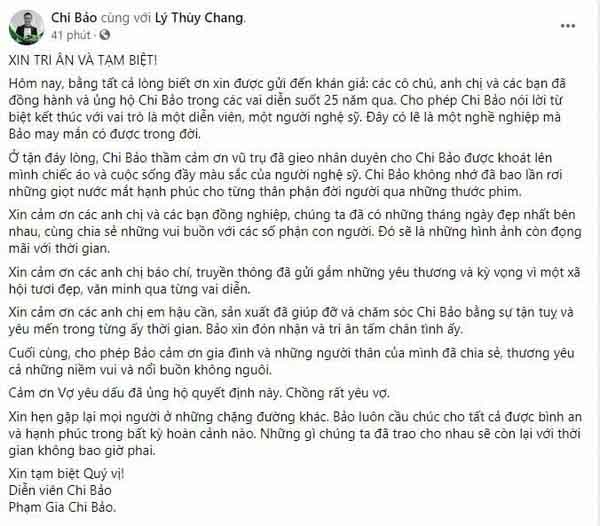 Cuối bài viết, Chi Bảo mong gặp lại mọi người trong những chặng đường khác, còn những gì đã dành cho nhau sẽ còn mãi với thời gian. Liên hệ với Chi Bảo, anh xác nhận với Thanh Niên sẽ dừng sự nghiệp diễn viên. Chia sẻ về lý do quyết định giải nghệ, Chi Bảo nói rằng anh nghĩ đã đến lúc dừng lại. Bà xã Lý Thùy Chang cũng bày tỏ sự ủng hộ với quyết định của Chi Bảo: “Yêu thương chồng. Vợ luôn ủng hộ mọi quyết định của chồng vì vợ biết chồng luôn đúng”.
