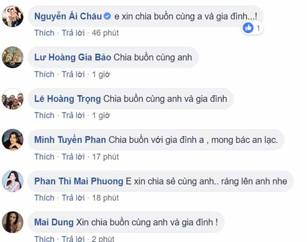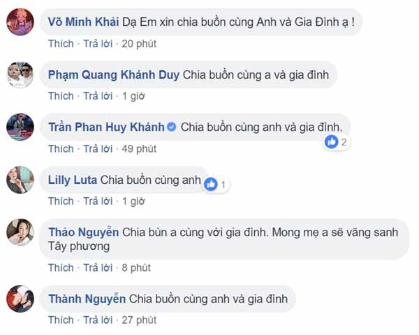 Gia Bảo, Bella Mai , Ái Châu, Mai Phương, Huy Khánh và đông đảo đồng nghiệp chia buồn cùng anh