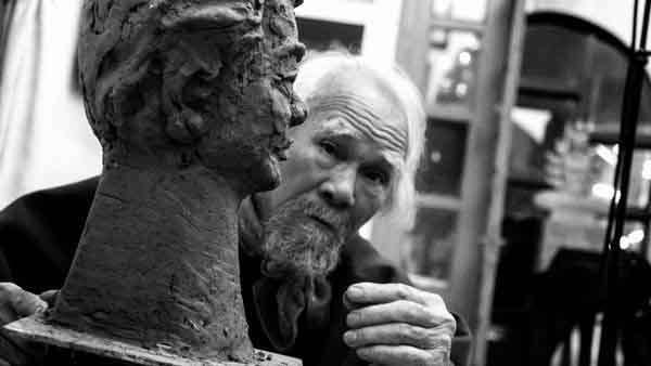 Điêu khắc gia Phạm Văn Hạng đang làm việc với tác phẩm đang hoàn thành. (Ảnh: NVCC)