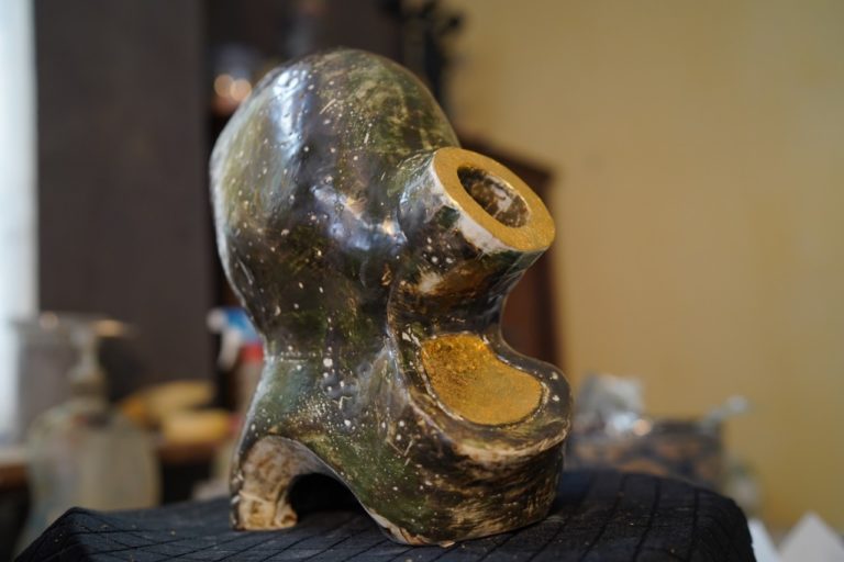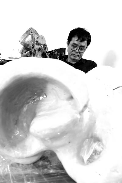 Đinh Phong trong xưởng làm việc bên một phác thảo điêu khắc mới.