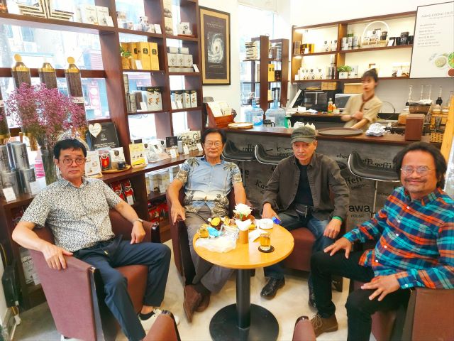 Từ trái qua: Họa sĩ Đinh Phong, nhạc sĩ Dương Thụ, Điêu khắc gia Đào Châu Hải và nhà thơ nhạc sĩ Nguyễn Hữu Hồng Minh. Cà phê thứ Bảy – Hà Nội 20.3.2021.
